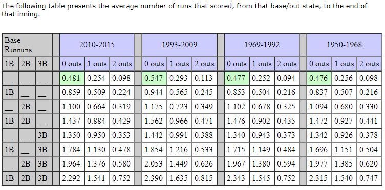 So with a runner on first and nobody out, the average number of runs scored between 2010-15 was .859. Bunt that runner over to second, and the runs number falls to .664.