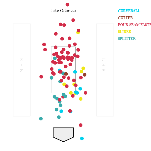 Perhaps most amazing was that of the 16 swinging strikes Odorizzi accrued — a terrific figure on 92 pitches thrown — 15 came on his four-seam fastball. Odorizzi mixed the fastball extremely effectively up in the zone, something that worked well as he sat in the 90-93 mph range with the offering.