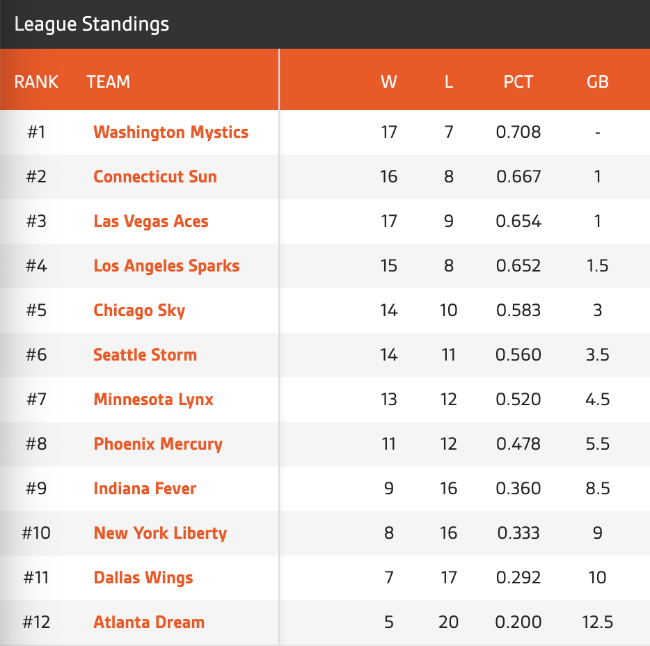 On the outside looking in: No. 9, Indiana Fever (9-16 overall, 8.5 GB); No. 10, New York Liberty (8-16 overall, 9 GB); No. 11, Dallas Wings (7-17 overall, 10 GB); No. 12, Atlanta Dream (5-20 overall, 12.5 GB).