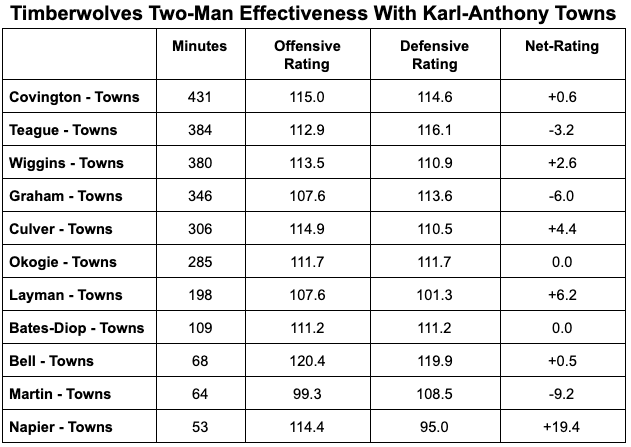 Minutes Played With Towns: | 285 Net Rating: 0.0 | Offensive Rating: 111.7 | Defensive Rating: 111.7