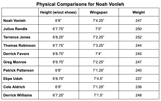 The argument for Vonleh is size, plain and simple. At 6’8″ (without shoes), Vonleh marks a typical height of a big man, but his 250-pound frame with a 7’4.25″ wingspan makes him, physically, almost a rare breed. While Rosas and Saunders have made it known they want Covington to play the four, there may be bigger opponents that using Covington against just doesn’t work.