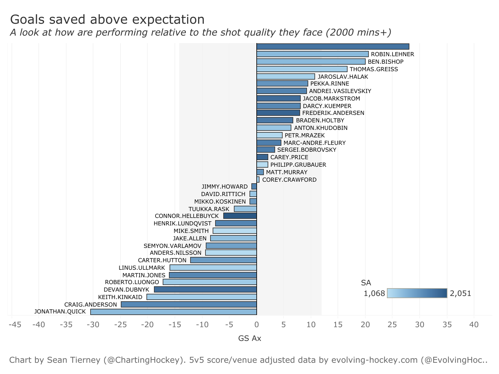 Looking at Evolving Wild‘s model, Dubnyk’s goals saved above expected — which measures goals allowed against the expected goals against — was -18.79 which was fourth worst in the league as you can see in the chart above.