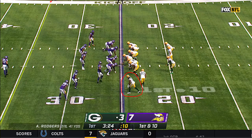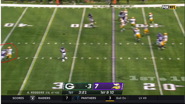 With Adams no longer on the screen, it’s at this very moment when Rodgers realizes that he has room to escape the pocket and attack the Vikings in multiple ways. Rodgers can take the safe, intermediate throw to either MVS, Williams or Lazard and pick up positive yards for a third and manageable. Rodgers also appears to have a running lane, if he so chooses, to pick up as many yards as he can before setting up a pivotal third down.