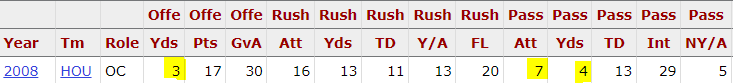 Now, let’s shift our focus to his son Kyle and take a look at how his offense did during his debut as a play-caller during the 2008 season with the Houston Texans.