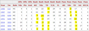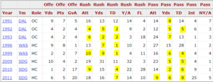 Next up we have Paul Hackett, who spent nine years as an NFL offensive coordinator from 1993-97 with the Kansas City Chiefs and 2001-04 with the Jets. Unfortunately for Paul, he never coached an offense that ranked in the top 10 in both points and yards. The hallmark of a Paul Hackett offense was run-game dominance, having ranked in the top 10 in rushing yards on five different occasions. However, Hackett’s passing game never seemed to get off the ground, ranking 22nd or worse in five of his nine seasons as an OC.