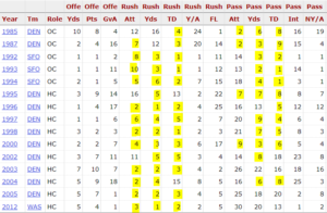 As the table above illustrates, Mike Shanahan made damn good use of both the run and pass game during his 15 most successful seasons as an NFL play-caller. The elder Shanahan consistently ranked in the top 10 in rushing attempts, rushing yardage, and rushing touchdowns. And when Shanahan had the luxury of coaching legendary quarterbacks like John Elway and Steve Young, his offenses were league leaders in passing yards and passing touchdowns.