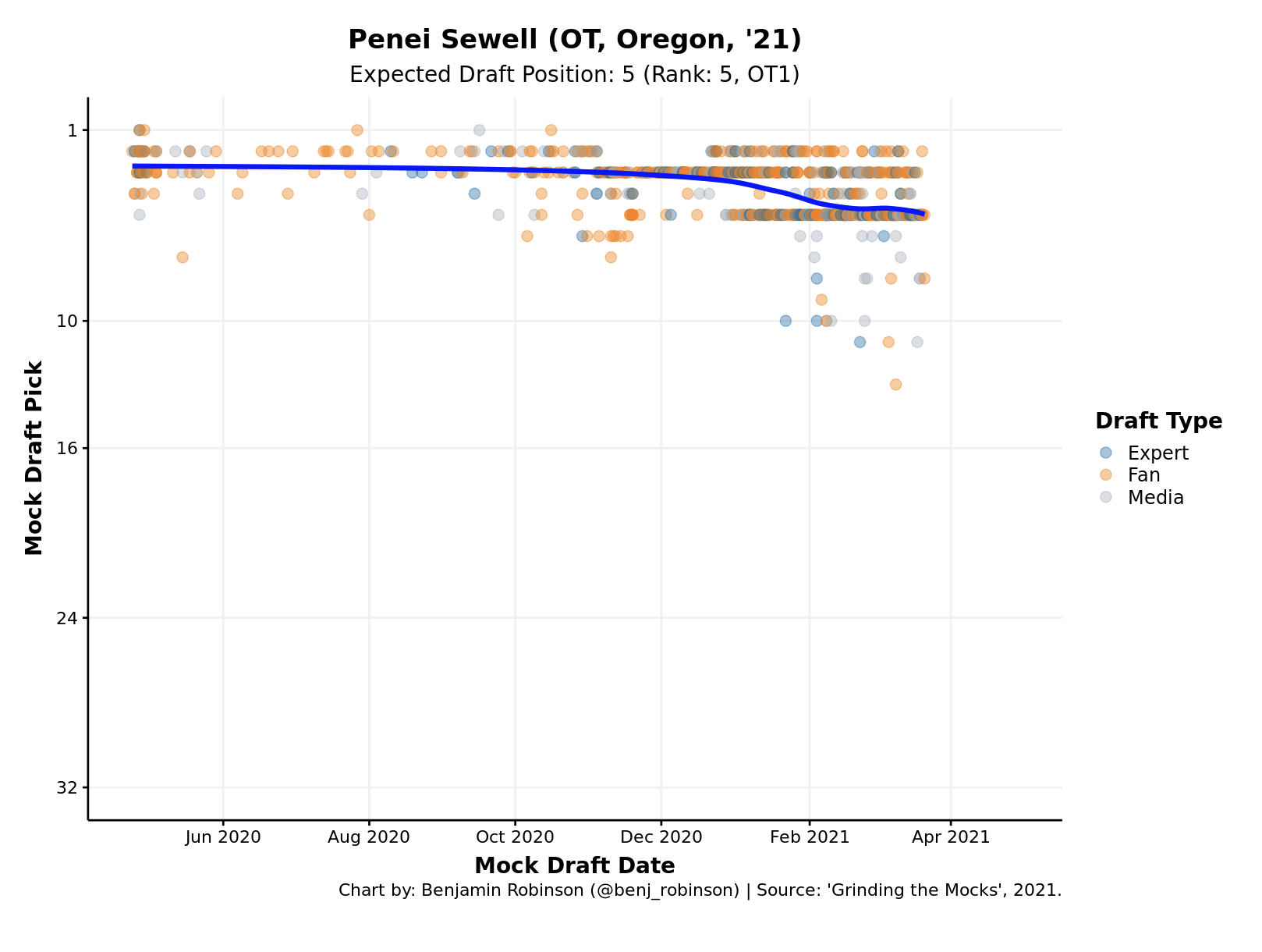 Grinding The Mocks can help us sort this year out. This evolves over the course of draft season, but it provides us a window into the current consensus view on draft prospects. Relevantly, there seems to be a big clump between picks 17 and 21. All of those players (Alijah Vera-Tucker, Rashod Bateman, Kwity Paye, Gregory Rousseau, and Greg Newsome) are averaging roughly the same position in the aggregate. That means trading down to 17 and trading down to 22 will get you a player whose consensus value is considered very similar.