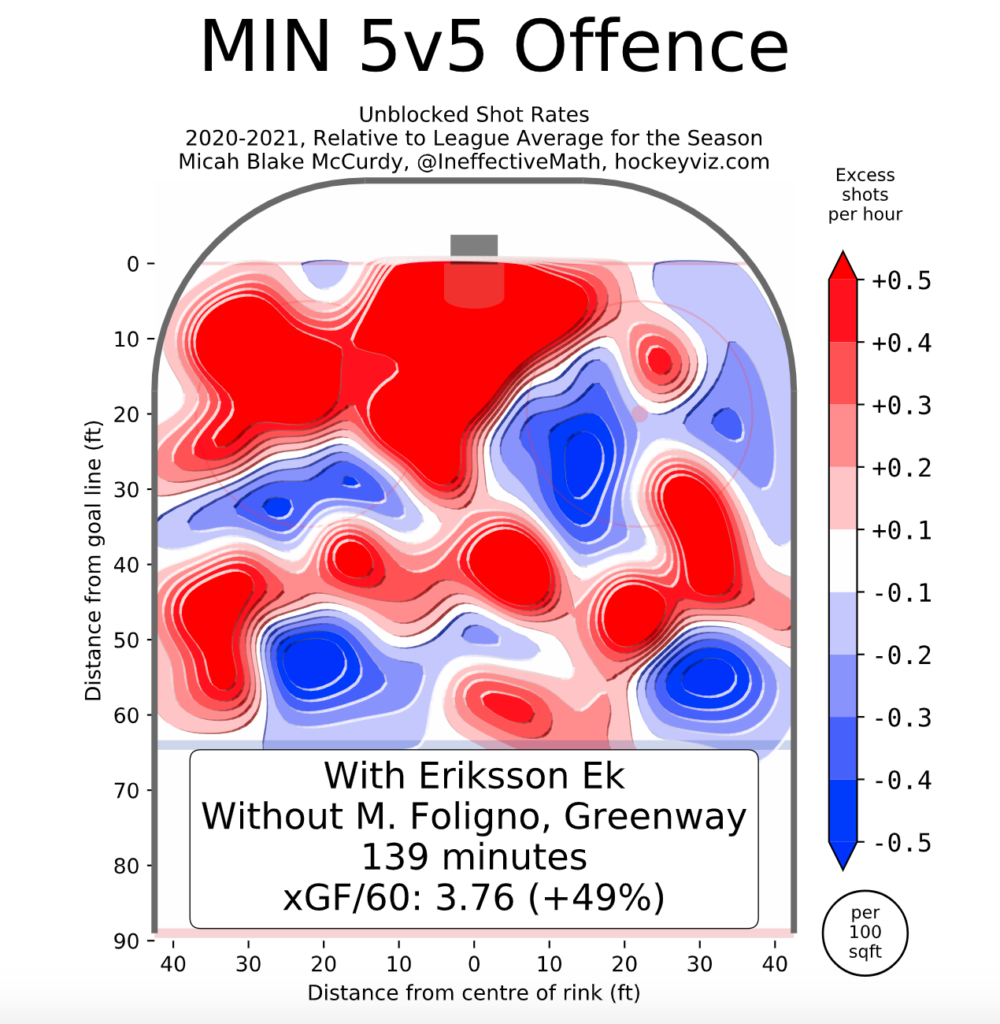 Yes, they were certainly effective together, with the trio taking 65.7% of the expected goal share at 5-on-5. But Eriksson Ek was very effective away from Greenway and Foligno, particularly offensively. HockeyViz shows Eriksson Ek’s heat map in those situations. Note the sea of red.