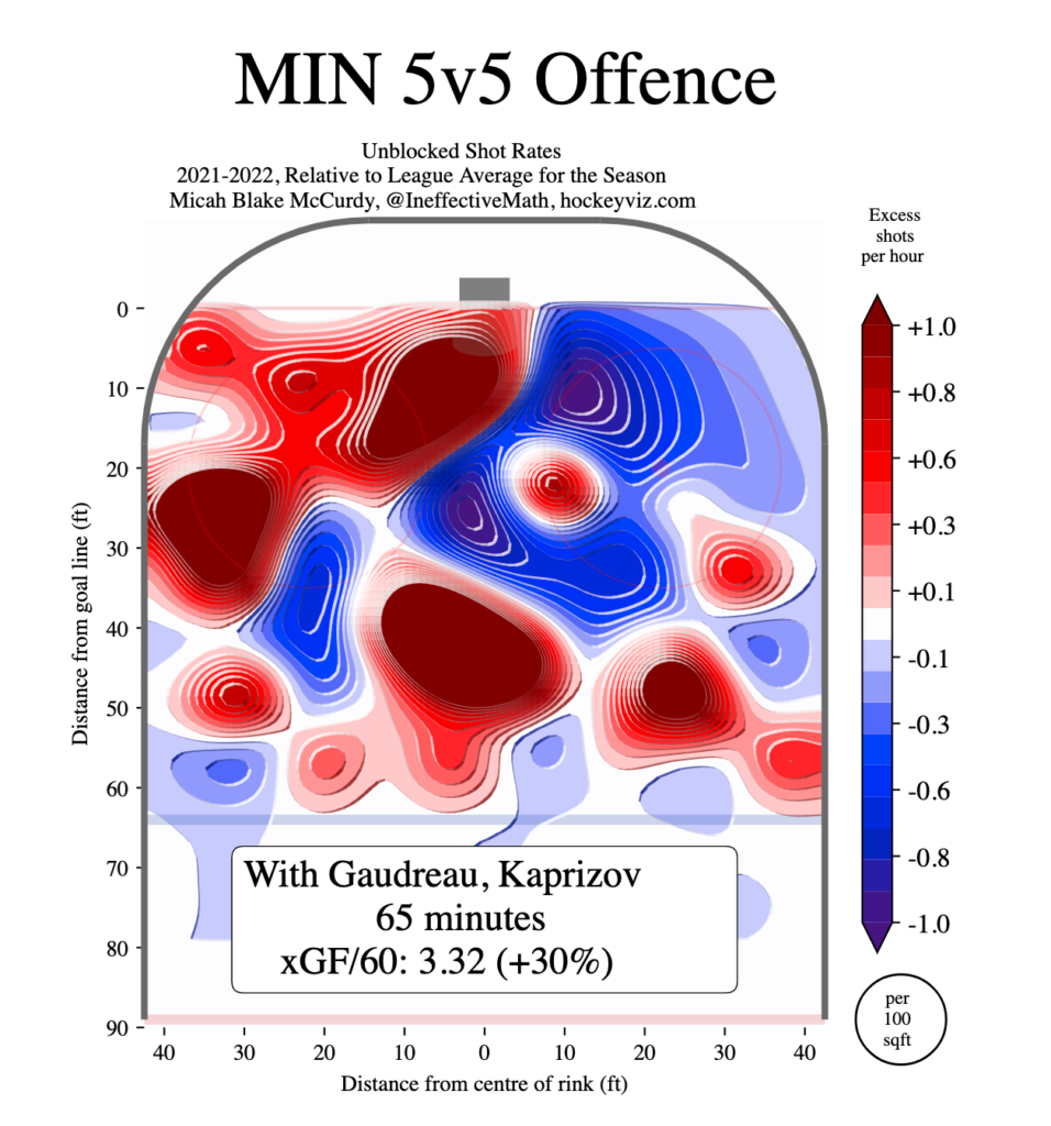 On the score sheet, not exceptionally well. Opponents are out-scoring Kaprizov and Gaudreau 4-2 through 65 5-on-5 minutes together. But the underlying numbers strongly hint that these two can find success. Here’s where they’re finding their shots.