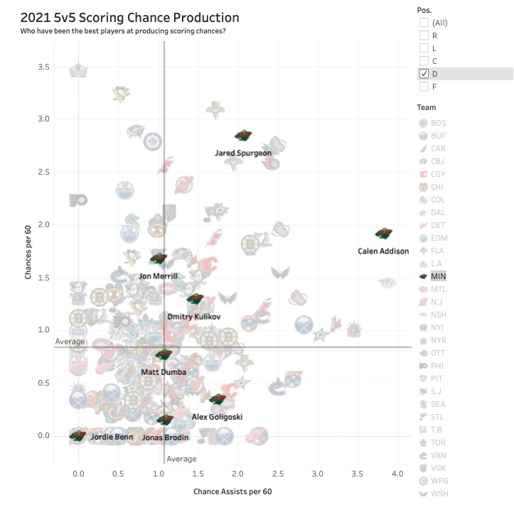 Better yet, Spurgeon is no bystander when it comes to the offense, picking up assists by osmosis while talented forwards do their thing. Minnesota has focused a lot of their offense around Spurgeon, and he’s rewarded them by being one of the best defensemen at generating scoring chances at 5-on-5. Thanks to Corey Sznajder’s tracking data, we can see his impact in not just his shooting but his playmaking as well.