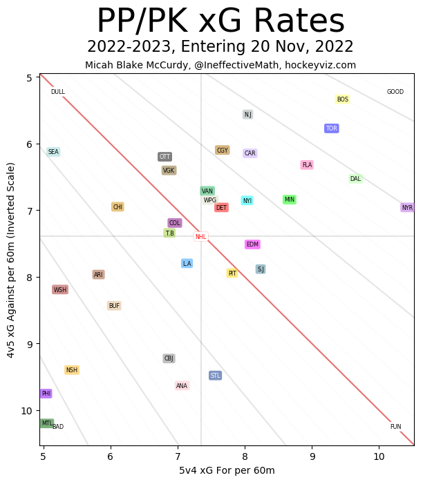 This is happening despite the team’s overall struggles. Goal droughts, sketchy defense, and backup goaltending concerns seem to have little or no effect on the Wild’s penalty-killing improvement. Per HockeyViz.com by Micah Blake McCurdy, the Wild are firmly on the “Good” side of special teams, thanks mainly to the Wild’s ability to kill penalties and score in shorthanded situations.