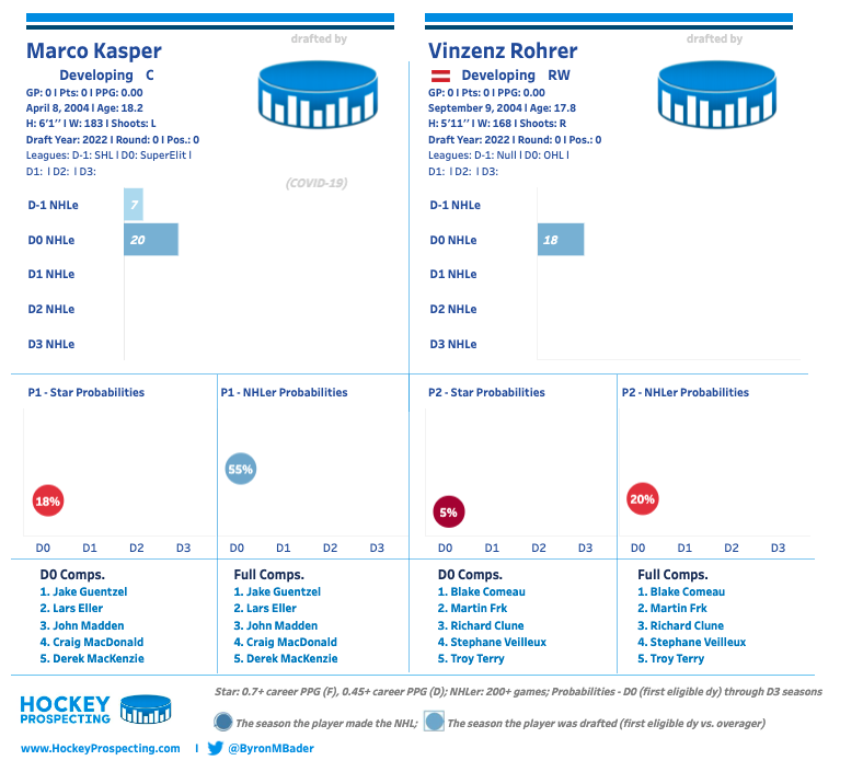 Kasper’s statistical profile isn’t quite so great, though. Byron Bader’s model only projects an 18% chance of being a star player, lower than you’d want in a potential top-10 pick. But part of this is due to low ice time, and another part of this is getting little playing time last year due to the pandemic. His six points (three goals) in 13 games for Rogle hint at more.