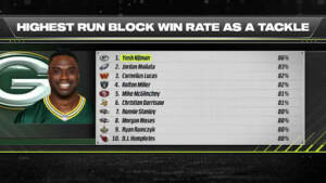 Darrisaw finished as the sixth-highest tackle in the performance metric of run-block win rate. He dominated in the run game, opening up massive holes on the left side of the line, and was excellent in protecting Kirk Cousins against opposing edge rushers.