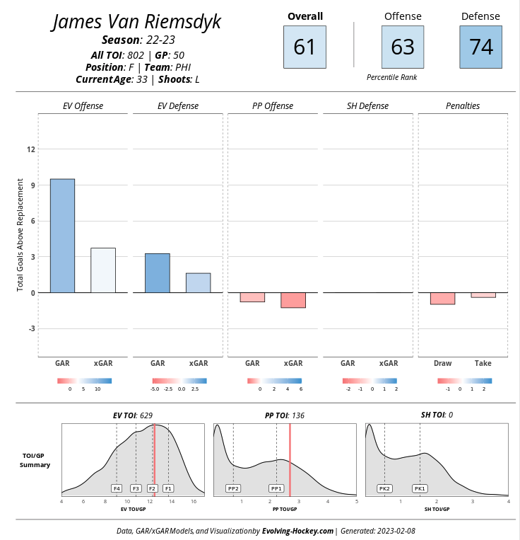 The Philadelphia Flyers have scored 3.47 goals per 60 this year with van Riemsdyk on the ice at 5-on-5. That ties him with Matty Beniers as the 36th-best rate in hockey among 376 forwards who’ve played 300-plus minutes. Philly also shoots 32.1 times per 60 with him on the ice, which is 117th in the NHL.