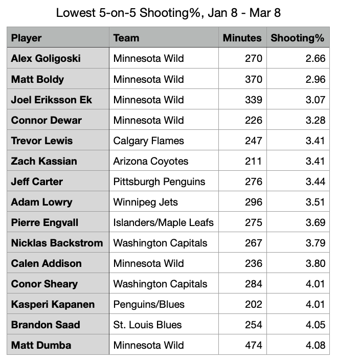 In the two months before Kaprizov’s injury (January 8 – March 8), the Wild shot a ghastly 4.8% at 5-on-5. That wasn’t just the worst rate in hockey. The Ottawa Senators were 31st over that time, the next-worst team, and even they shot 6.0%.