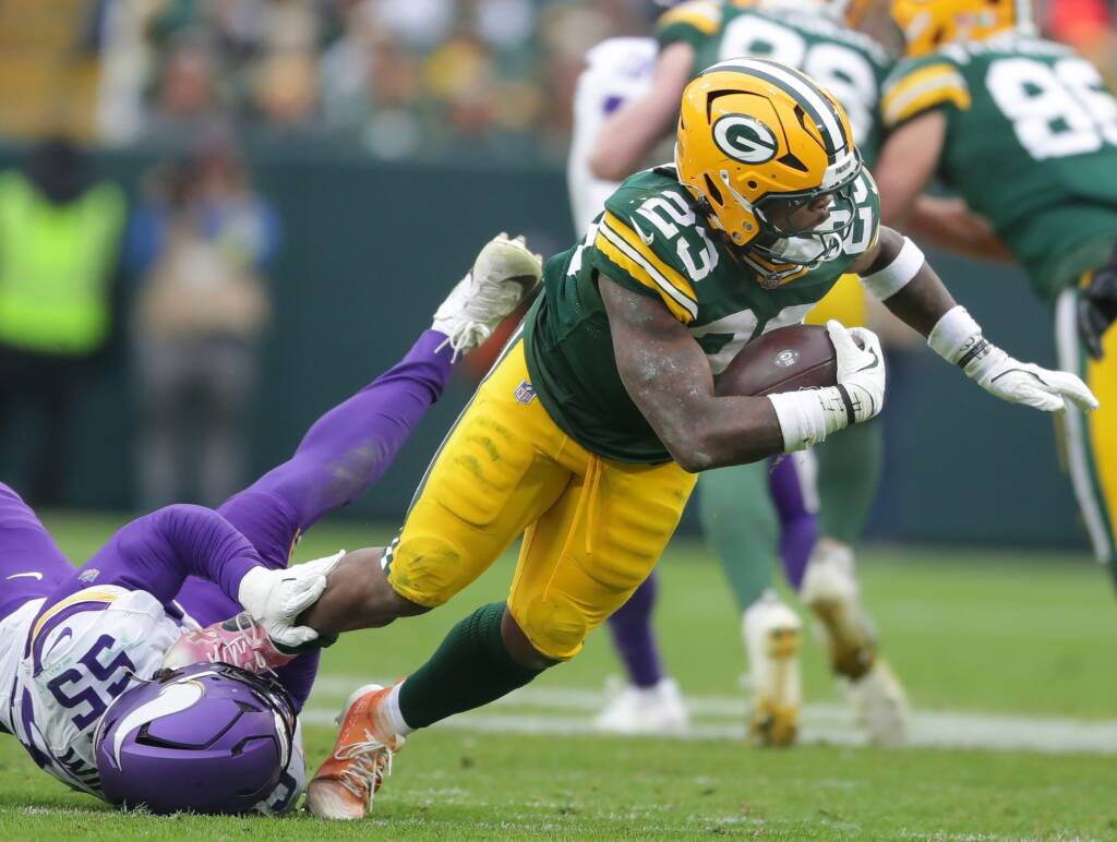 Wilson had a breakout game on Sunday against the Minnesota Vikings. He earned his first career start and delivered 107 yards on 28 carries with a pair of touchdowns. Wilson’s 107-yard, two-TD performance puts him in an exclusive club. He’s just the second Packer since the 1970 merger to post 100-plus rushing yards and multiple rushing scores in his first NFL start. After going without a touchdown through the first 10 weeks, he now has three in the last game and a half, including the first two-touchdown outing of his career.