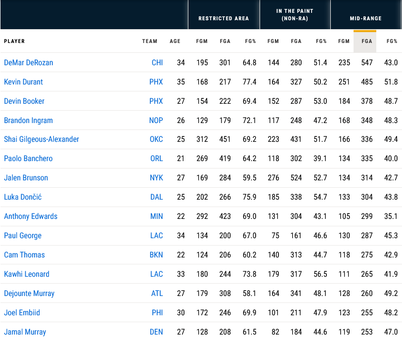 Despite Edwards showcasing an improved ability to take and make mid-range shots in the 2023-24 season, he didn’t rank well in efficiency amongst the NBA’s high-volume mid-range shooters. Among the NBA’s top 15 mid-range shooters in attempts, Edwards ranked last in FG% at 35.1%. He was the only player within the top 15 to shoot below 40%.