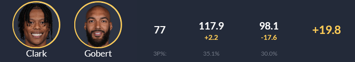 The most important thing for Clark offensively is that he is surrounded by shooting threats. Opponents have begun to sag off of Clark and onto more impactful offensive threats in the paint when he is stationed in the corners. Therefore, if Clark is on the court with Gobert, then the offense will grind to a halt.